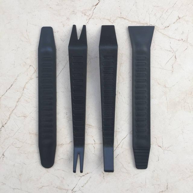 Набір із чотирьох інструментів для безпечного та швидкого демонтажу пластикових деталей салону, обшивки, декоративних накладок, молдингів, плафонів та іншого. Лопатки виготовлені з різним кутом вигину, що дозволить демонтувати пластикові накладки із тонкими щілинами. Даний набір для зняття пластикових деталей допоможе Вам встановити ремкомплект обмежувачів дверей.